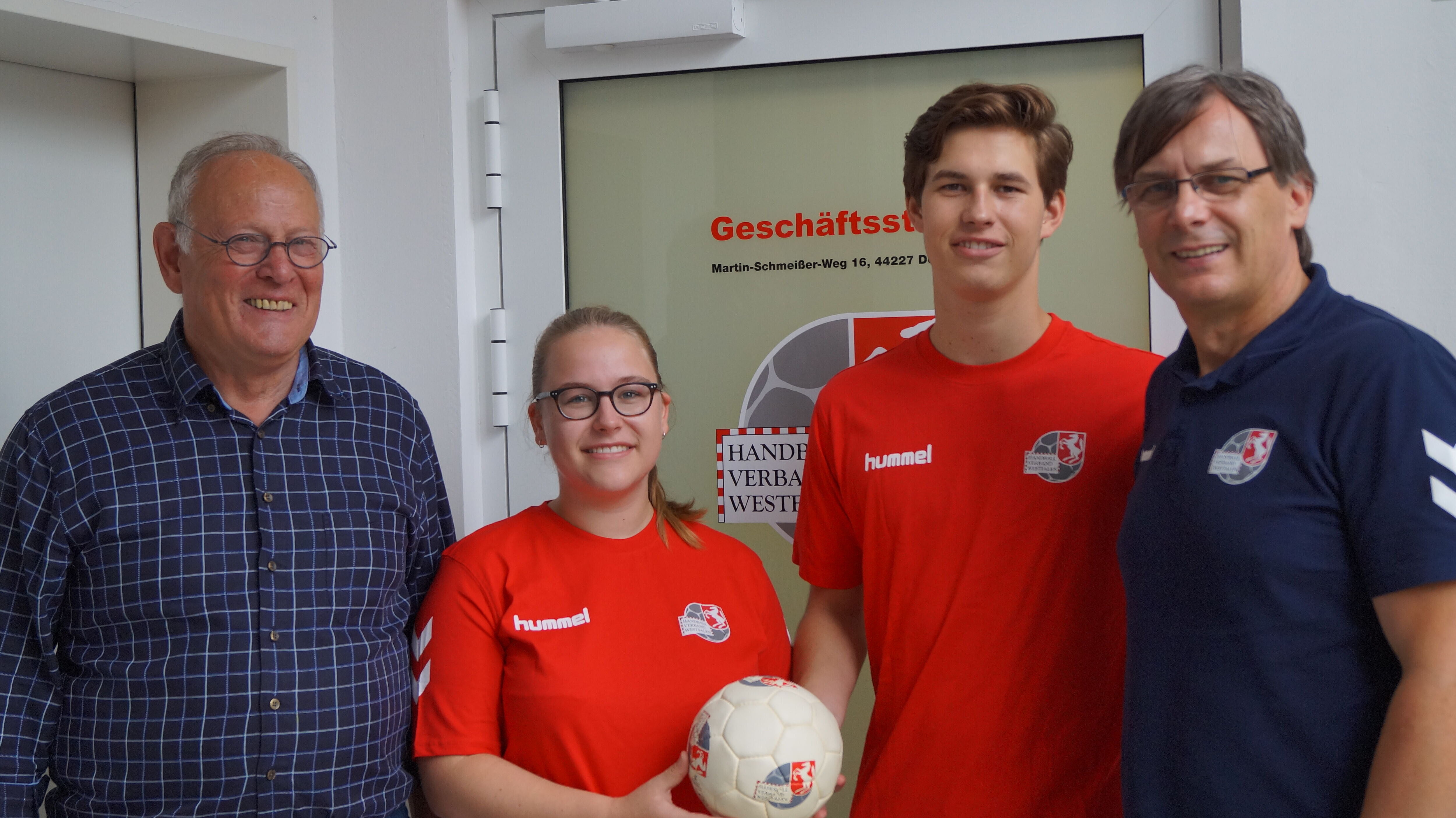 So wie jedes Jahr wird Anfang September das Amt des Bundesfreiwilligendienstes beim Handballverband Westfalen neu besetzt. So dürfen wir auch dieses Jahr ein neues Mitglied begrüßen, Marie Händel aus Mengede. Sie wird ab dem 1. September ihren Vorreiter Simon Skupin ablösen. Dazu wurde sie in der Geschäftsstelle vom HV Westfalen Präsident Wilhelm Barnhusen, Landestrainer Zsolt Homovics und Bufdi Simon Skupin zur Ballübergabe als neue Bufdi empfangen. So kann Marie nicht nur in ihrem Verein, TV Mengede, ihrem Hobby nahe sein, sondern beim HVW die Sportart von der anderen Seite aus betrachten.