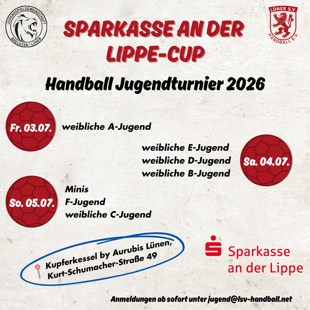 | 03.-05.07.2026 | Sparkassen an der Lippe-Cup 2026 | wA-Jgd., wB-Jgd., wC-Jgd., wD-Jgd., wE-Jgd., wMinis | Halle | JSG Brechten Lünen | Kupferkessel Lünen | Ausschreibung |